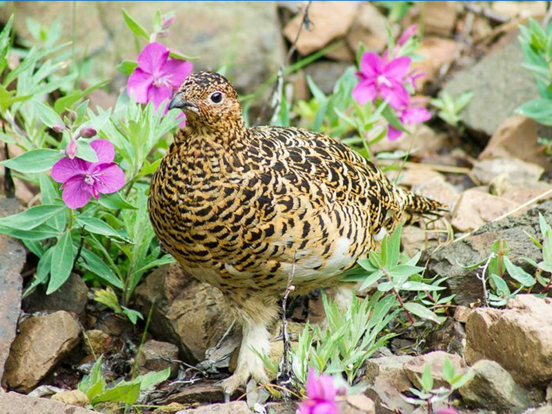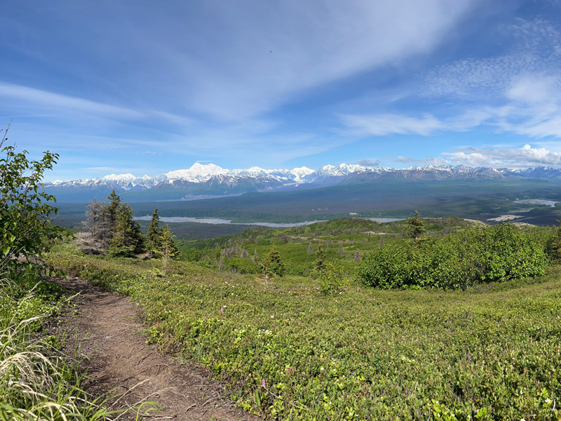 The Area around the K’esugi Ridge Trails hosts a wide variety of wildlife such as brown and black bears, moose, ermines and marmots. In the lower areas, you might encounter muskrats, beavers, red foxes, porcupines, and a rich bird community. Over 120 bird species migrate through or breed here. Common species are chickadees, willow ptarmigan and gray jays; migratory species include the Wilson’s warbler, the Arctic tern, the lesser golden plover, golden-crowned sparrow, and ruby-crowned kinglet. Water birds such as trumpeter swans, loons, and osprey fly are seen in lakes and rivers. Views of Denali and the surrounding park can be spectacular. Weather can often be cloudy around Denali, we estimate that clear views happen about 30% of the time. But when Denali is out it is spectacular!